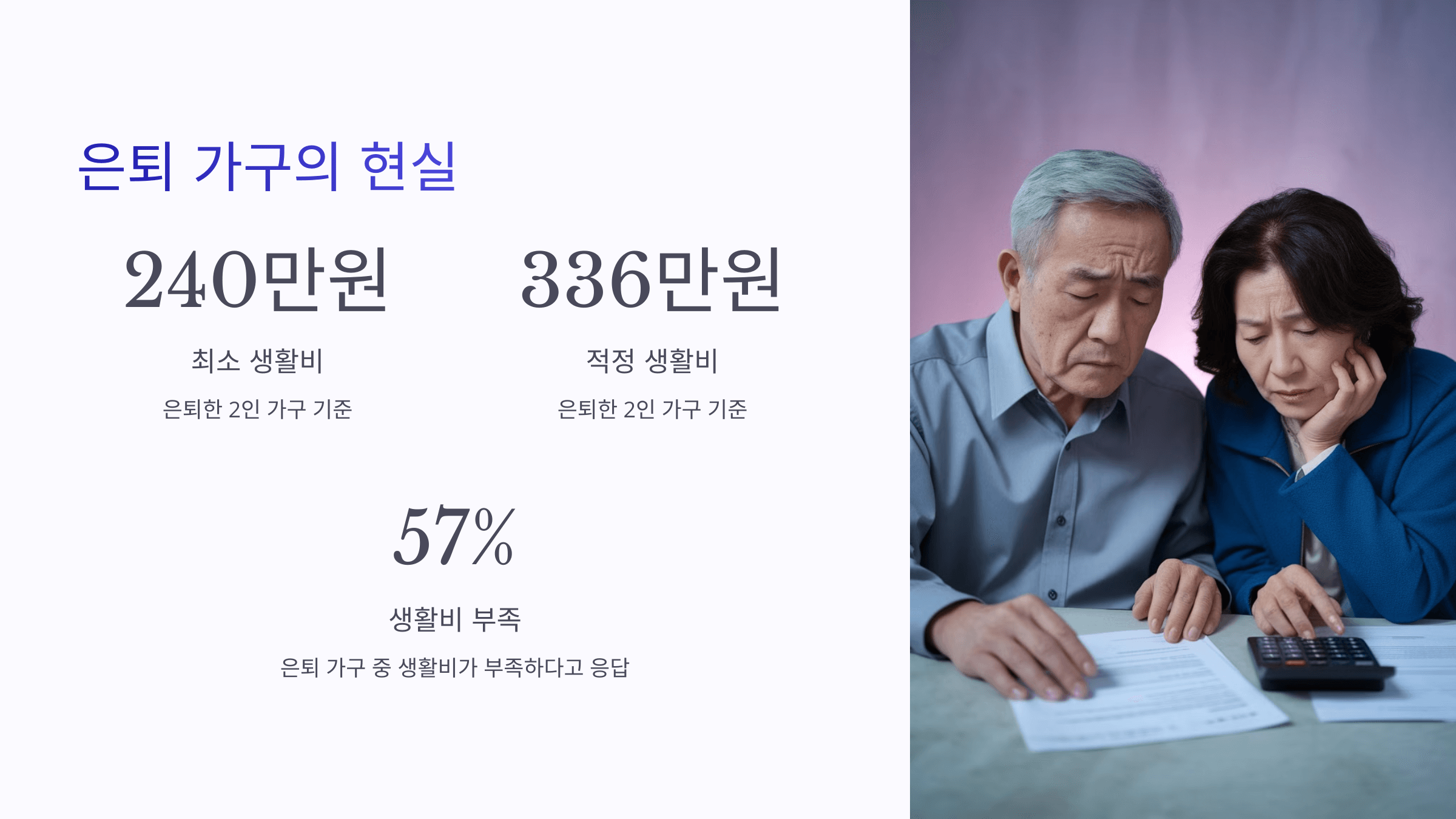 통계청이 발표한 2024년 가계금융복지조사 결과에 따르면 은퇴한 2인 가구의 월 최소 생활비는 240만원, 적정 생활비는 336만원입니다. 그러나 이를 충당하는 데 부족하다는 응답이 57%를 넘었습니다.