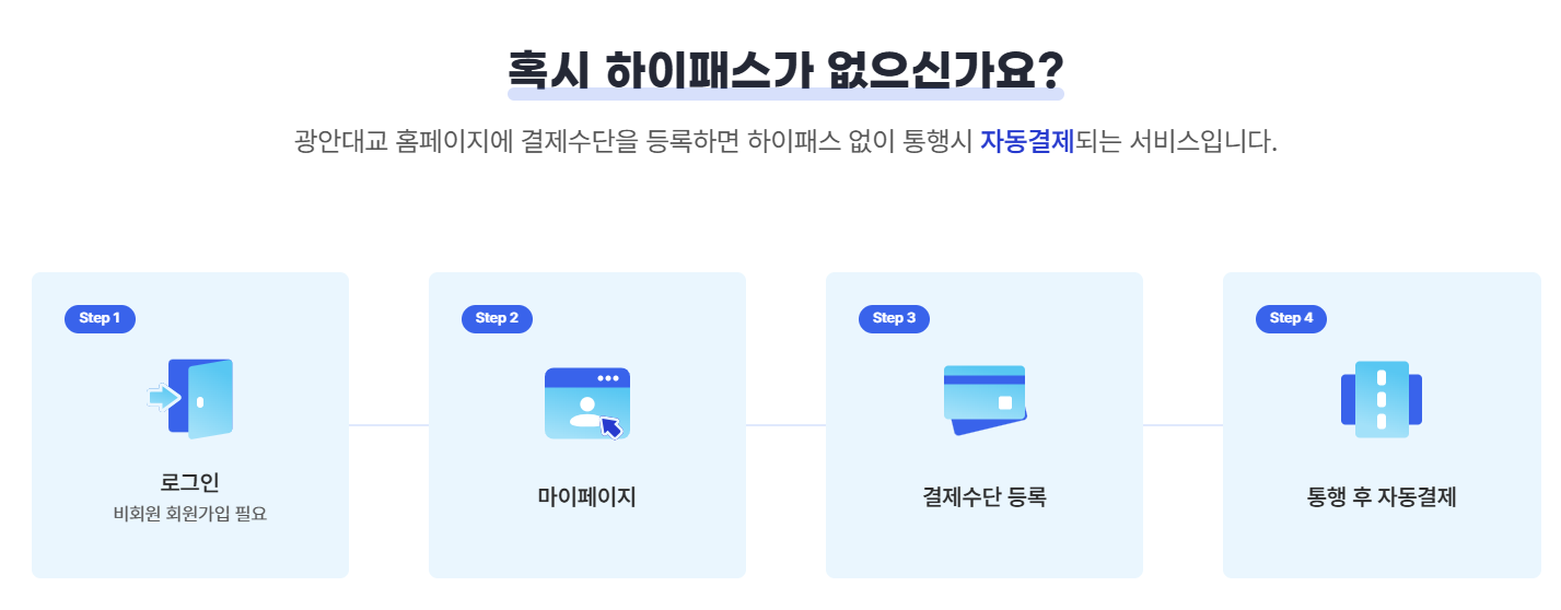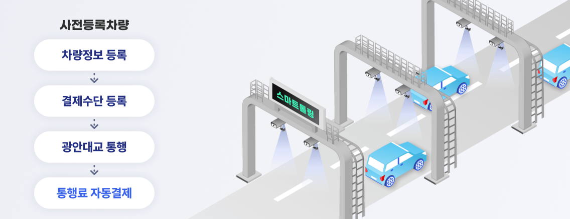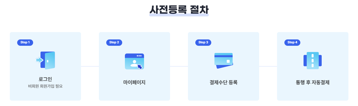 - 하이패스 없이도 차량번호 및 카드 정보 등록 시 자동 결제 가능