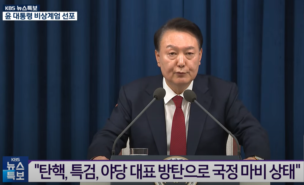 윤석열 대통령이 3일 밤 용산 대통령실에서 긴급 담화를 갖고 "저는 북한 공산 세력의 위협으로부터 자유대한민국을 수호하고 우리 국민의 자유와 행복을 약탈하고 있는 파렴치한 종북 반국가 세력들을 일거에 척결하고 자유헌정질서를 지키기 위해 비상계엄을 선포한다"고 밝혔다.