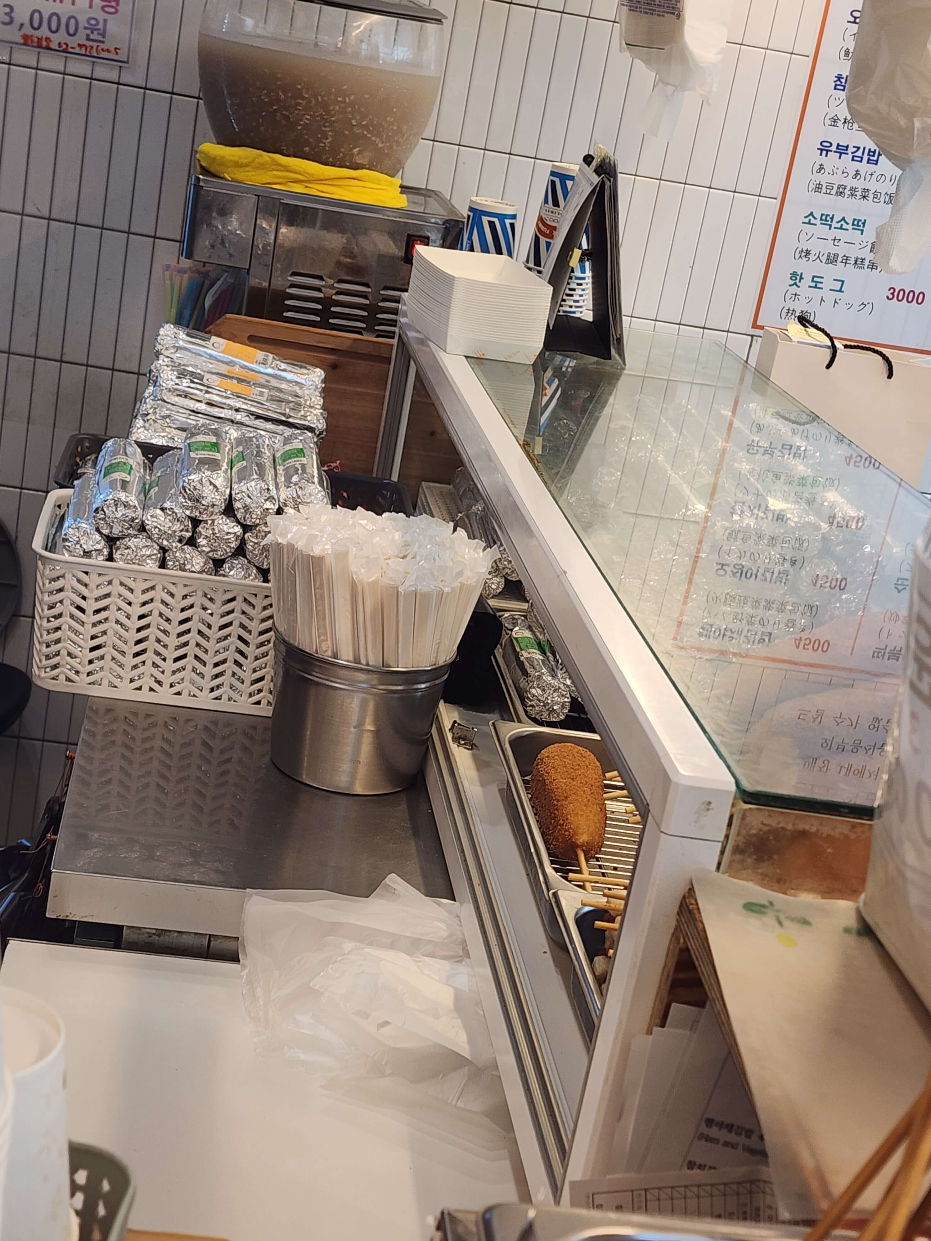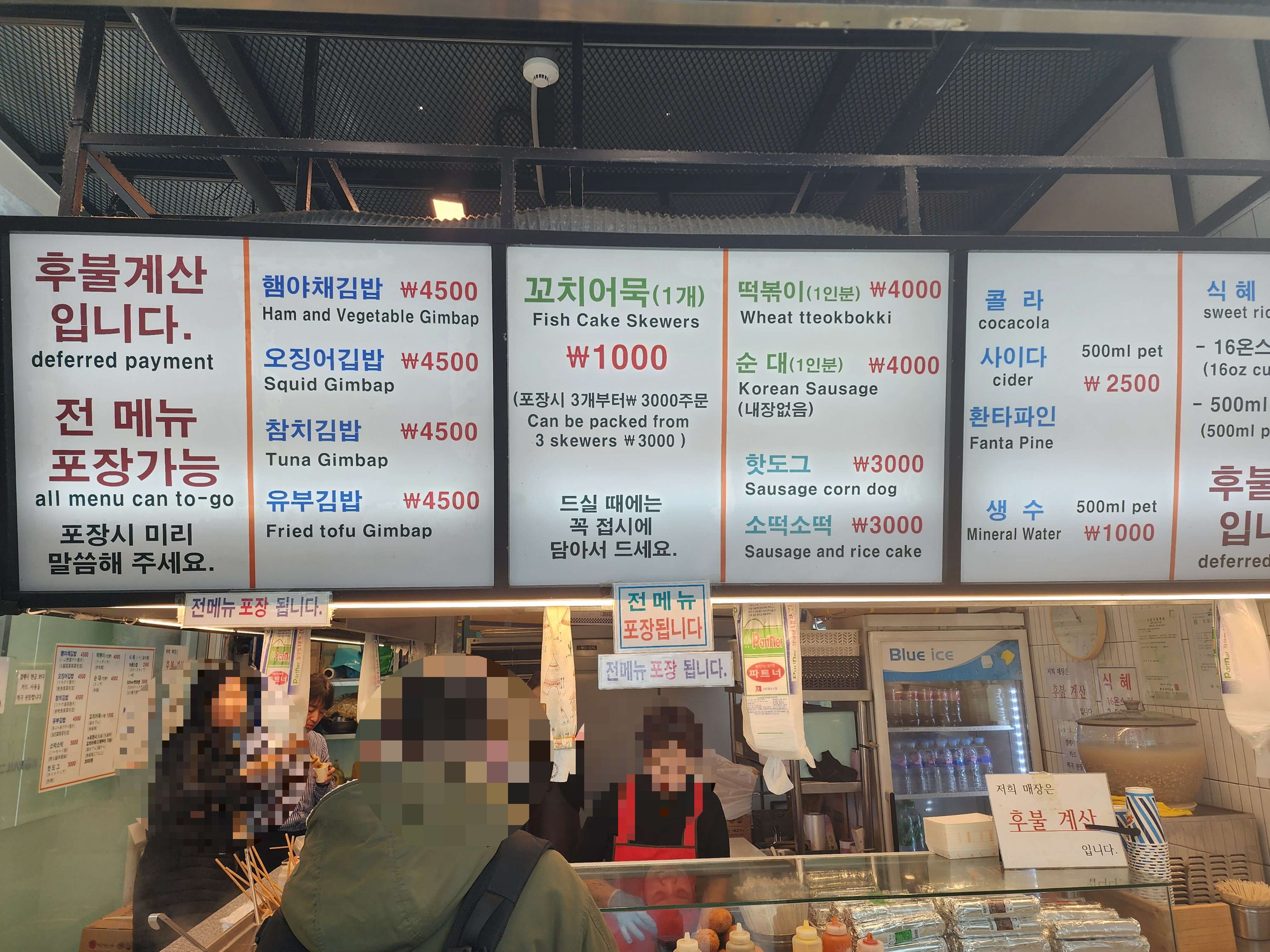 꼬치어묵 1개 1,000원 떡볶이 1인분 4,000원 순대 1인분 4,000원 핫도그 3,000원 소떡소떡 3,000원 식혜 2,500원입니다.