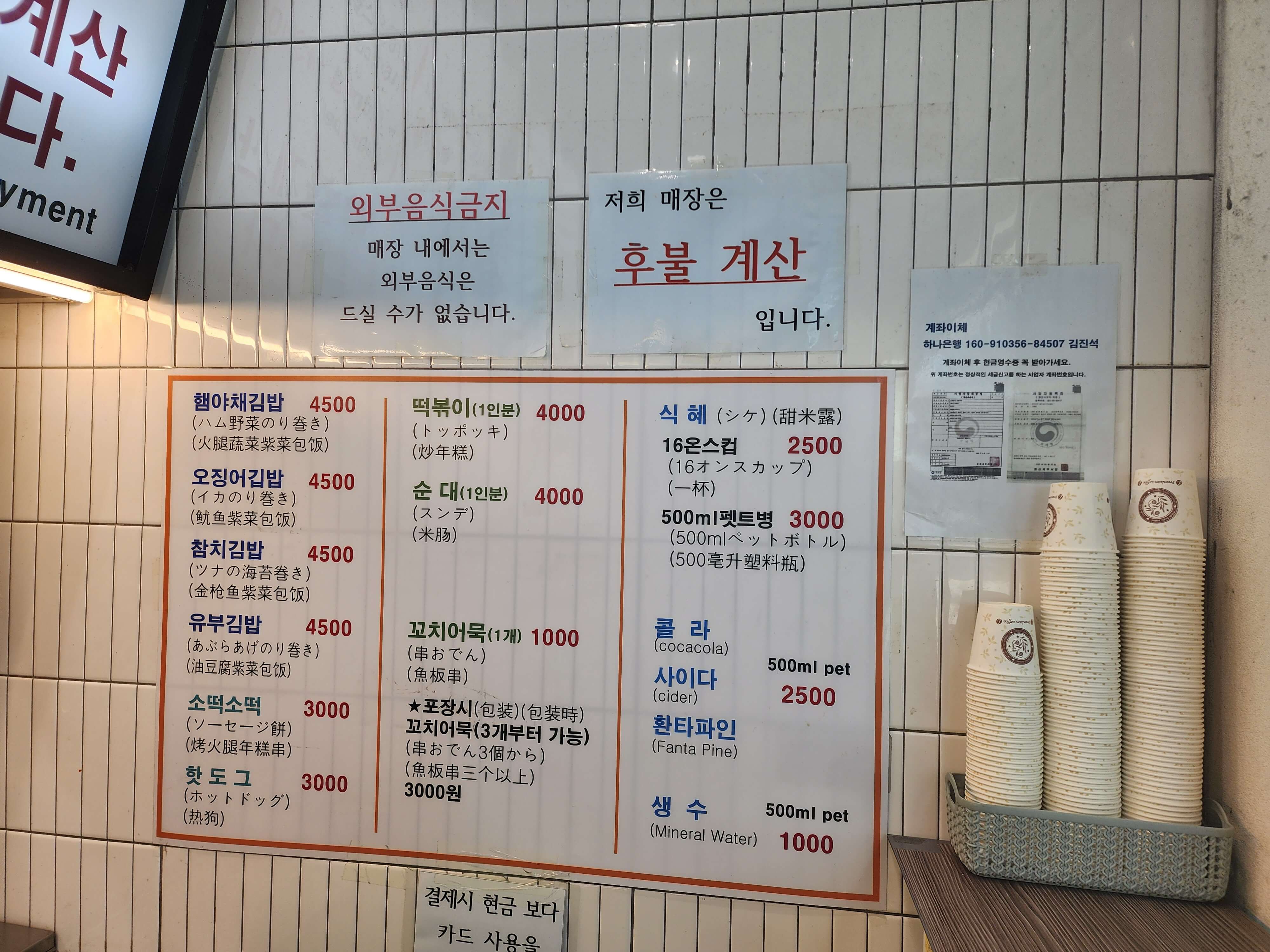 햄야채김밥 4,500원 오징어김밥 4,500원 참치김밥 4,500원 유부김밥 4,500원