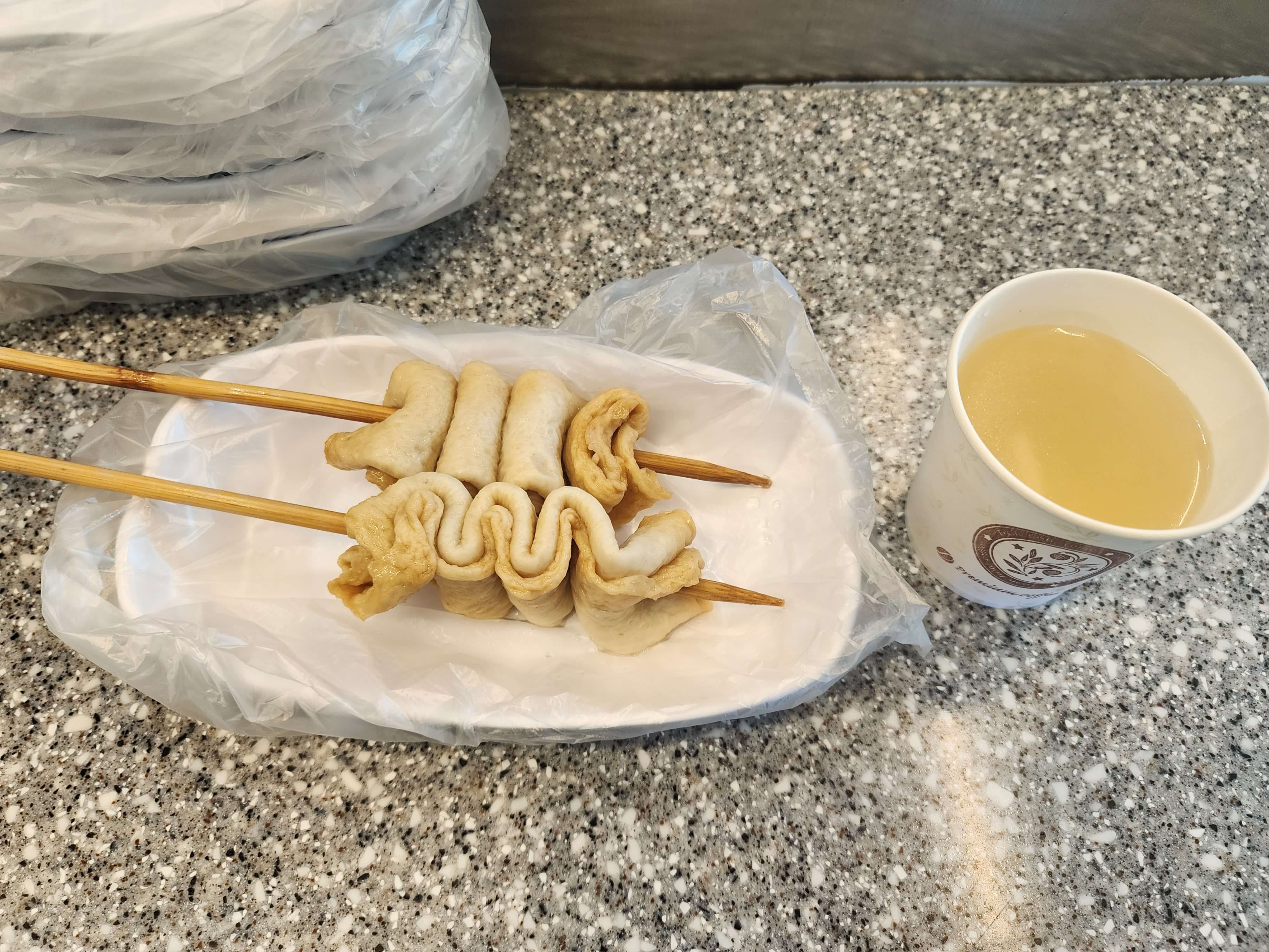 오뎅국물도 따르고 오뎅2개를 접시에 담았습니다