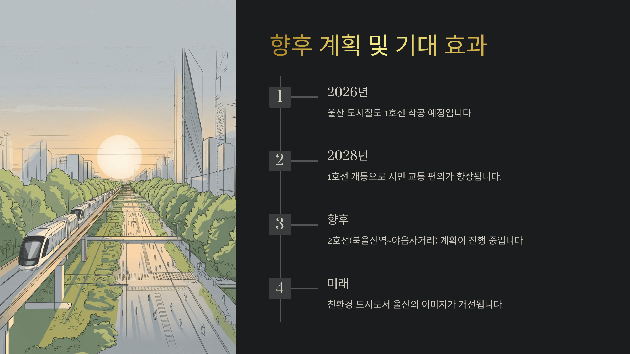 울산 도시철도 1호선 트램 도입은 교통 인프라 개선뿐만 아니라 부동산 시장에도 긍정적인 영향을 미칠 것으로 기대됩니다. 다만, 사업 속도와 지역별 영향 차이를 고려해야 하며, 트램 정거장 인근 지역이 가장 큰 수혜를 볼 가능성이 높습니다.