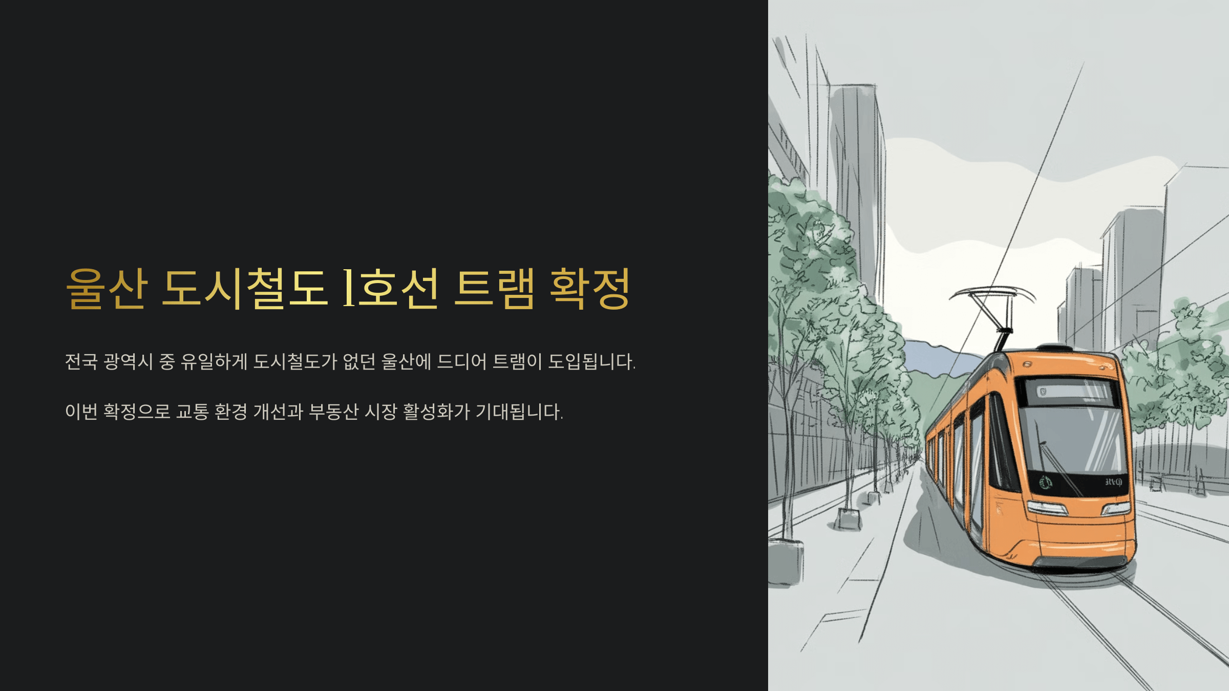 울산에 처음으로 도시철도(트램)가 들어섭니다. 전국 광역시 중 유일하게 지하철이 없던 울산이 도시철도를 도입하면서 교통 환경 개선과 부동산 시장 활성화에 대한 기대감이 커지고 있습니다.