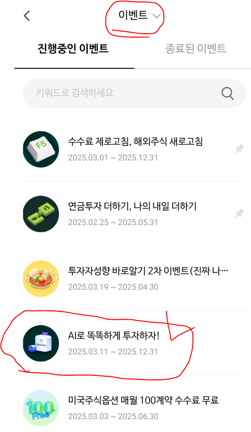 1) 나무중권 앱을 다운받아서 실행 후 이벤트 창에서 AI로 똑똑하게 투자하기 링크를 클릭합니다.