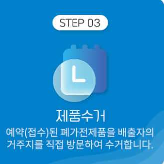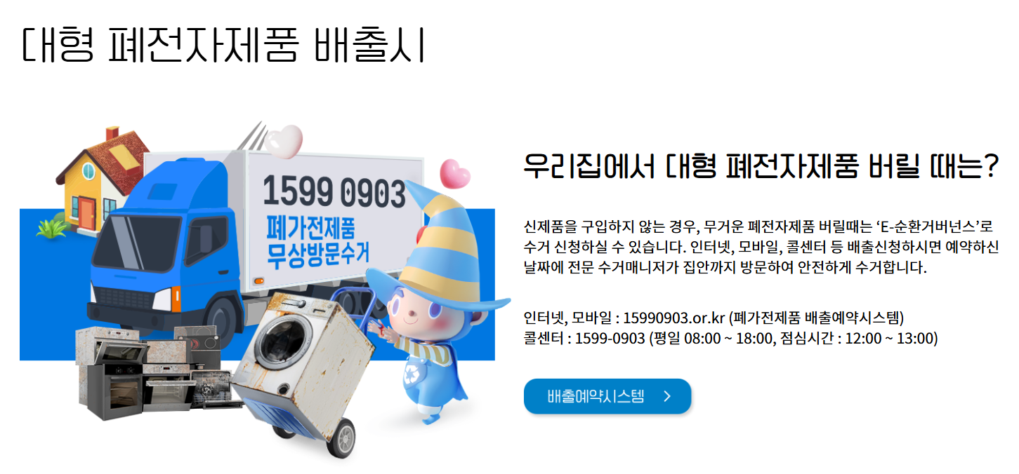 추후 폐가전제품 접수는 전화 1599-0903, 인터넷/모바일 https://www.15990903.or.kr/ 으로 수거예약이 가능합니다.