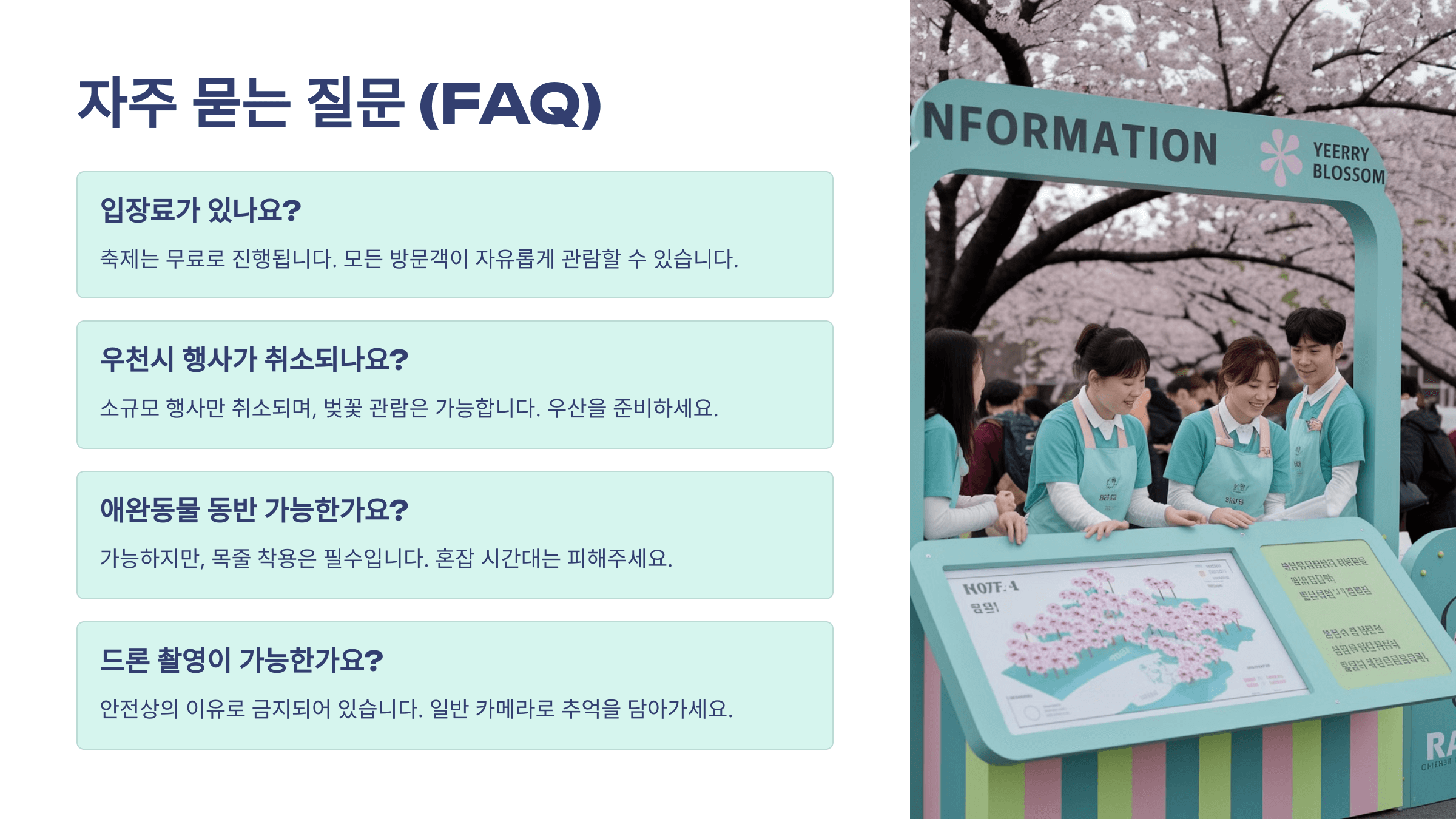 - 교통 통제: 축제 기간 동안 윤중로 일대는 차량 통제가 이루어지므로 대중교통 이용을 권장합니다. 차량 통제는 4월 2일 낮부터 시작됩니다.