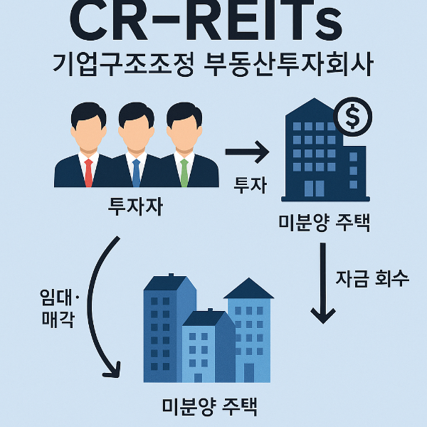 ✔️ CR리츠의 구조: 투자자들의 자금을 모아 지방 미분양 아파트를 매입 → 임대 운영 → 시장 회복 시 매각