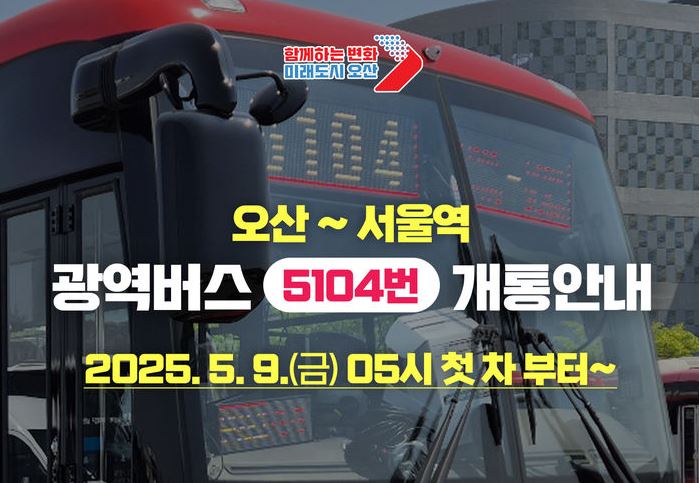 - 5월 9일부터 오산 세교지구 ↔ 서울역 간 5104번 광역버스 신설